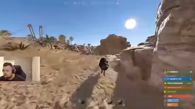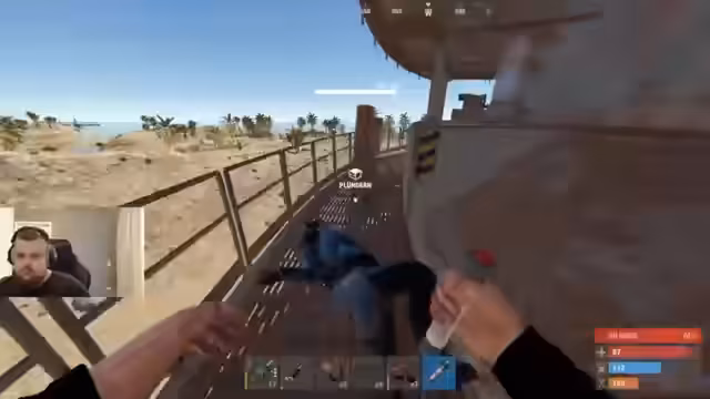 Die Rust-Umgebung wird erkundet, wobei ungewöhnliche Basen und Ressourcenmangel auffallen. Es folgen Diskussionen über Taktiken, Basenbau und Cheating-Vorwürfe gegen andere Spieler. Der Streamer hadert mit Pech, plant Raids und spricht über MMA und Fußball.
