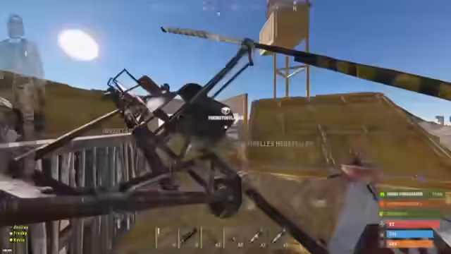 02:30:40Der Fokus verschiebt sich auf eine Base namens Kleine Öl, nachdem das Tugboat den Bereich verlassen hat. Der Streamer fliegt mit einem Minihubschrauber zur Position, während sein Teammate Kevin per Landweg vorgeht. An der Basis wird ein Angreifer per Headshot eliminiert, und ein Rocket Launcher wird als Beute sichergestellt. Kurze Zeit später wird der Streamer jedoch von einem Spieler namens Brody auf einem Attack Heli aus 300 Metern mit einer L9-Sniper Rifle attackiert und stark beschädigt.