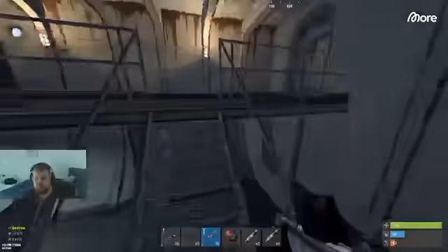 05:04:13In der finalen Phase des Streams wird der wohl größte Raid des Abends ausgeführt. Die Gruppe hat es geschafft, in eine große, offenbar mehrstöckige Metallbase einzubrechen, nachdem sie einige Türme und Stacheldrähte entfernt haben. Sie entdecken eine offene Kiste und viele Ressourcen, was darauf hindeutet, dass die Basis möglicherweise aufgegeben wurde oder dem Verfall preisgegeben ist.