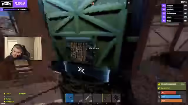 00:41:39Nach den ersten Kämpfen wechselt der Fokus auf das eigentliche Turnierprinzip. Das Team muss nun 'farming betreiben', indem es Ressourcen sammelt, um Waffen und Munition zu craften. Dies wird als äußerst ineffizient und frustrierend empfunden, da der Streamer das Gefühl hat, wertvolle Zeit zu verlieren. Diskutiert werden die Spielstunden und die Erfahrung der Teilnehmer. Es kommt zu technischen Problemen im Spiel, wie dem 'Share-System', das den Ressourcenaustausch zwischen Spielern behindert. Trotzdem wird die Basis weiter ausgebaut und auf Angriffe vorbereitet.