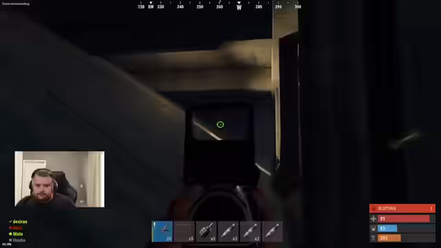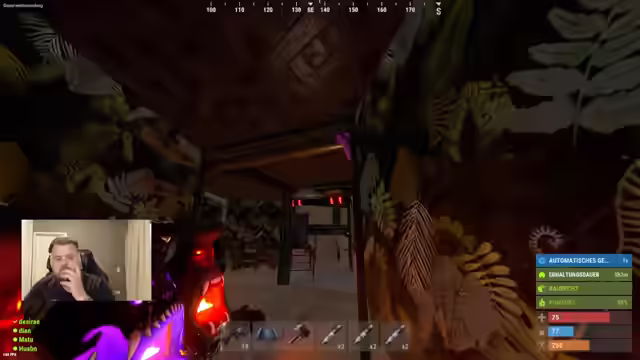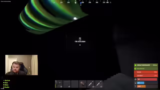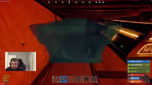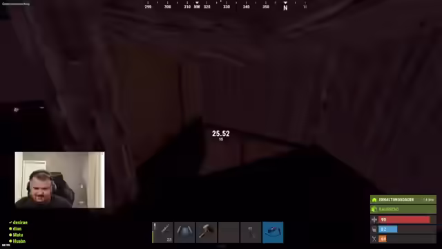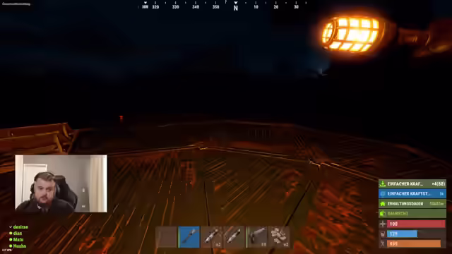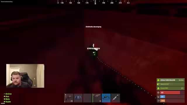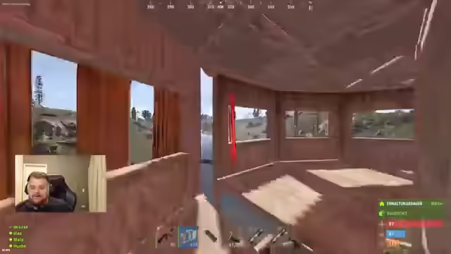05:21:29Ein Minikopter mit einem Hässe wird gesichtet, was kurzzeitig für Aufregung sorgt. Die Gruppe plant, ein Gebiet zu erkunden, um nach Ressourcen wie Sulfur und Metall zu suchen. Es wird überlegt, ob ein Kühler benötigt wird und wo sich die Bärenpastete befindet. Die Gruppe entscheidet sich, zur Giant Excavator und Powerblend zu fahren, um Low-Grid zu farmen. Es wird überlegt, Locker Kits zu automatisieren und ein Stack Low-Grid in der Zielkiste für Helikopter zu platzieren. Ein Teammitglied muss den Stream kurzzeitig verlassen, um eine Kühlung zu hängen. Es gibt Low-Grid-Probleme, obwohl zuvor 3000 Low-Grid vorhanden waren.