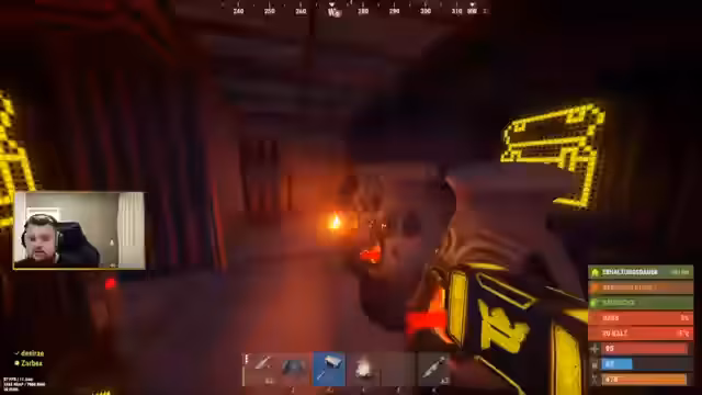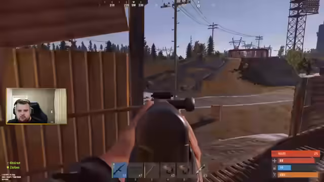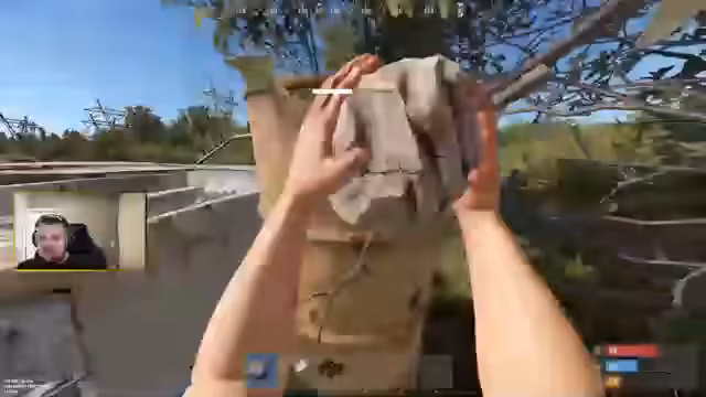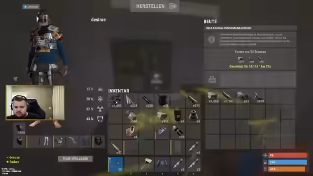 00:40:03Nach dem erfolgreichen Startpunkt wird der Bau einer eigenen Basis zur Priorität. Sie entscheiden sich für einen bergigen Standort und beginnen sofort mit dem Sammeln von Ressourcen wie Holz und Steinen sowie dem Erstellen von Werkzeugen. Der Bau des Haupttors (TC) und weiterer Fundamente beginnt. Währenddessen wird eine Begegnung mit einem nackten Spieler am Hubschrauber-Spawn als harmlos eingestuft. Das Gefühl der Sicherheit wird jedoch durch nahende Gegner getrübt, was zu einem spontanen PvP-Zusammentreffen führt, in dem beide Streamer getötet werden, aber wichtige Ressourcen wie Bärenfleisch und Nahrungsmittel erbeuten können.