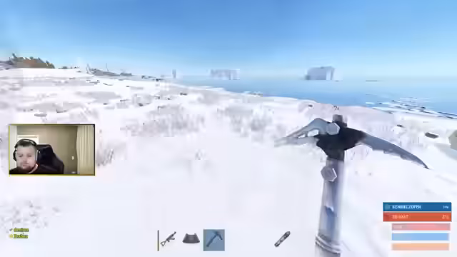 03:51:50Ein Spieler baut einen TC-Raum und wird dabei von einem Nachbarn beobachtet. Die Spieler planen, einen Shooting Floor zu bauen und die Bolt-Action Rifle zu lernen. Ein Spieler äußert den Wunsch, auf nackte Spieler zu schießen, um sich besser zu fühlen. Es wird ein Vergleich zu einer Szene aus Family Guy gezogen. Die Spieler diskutieren über den TC des Nachbarn und vermuten, dass er sie ärgern will. Ein Spieler äußert den Wunsch, den Nachbarn zu verprügeln. Sie beobachten, dass der Nachbar einen Shooting Floor baut, der auf ihre Base ausgerichtet ist. Die Spieler beschließen, ebenfalls einen Shooting Floor zu bauen. Sie werden von ihrem Nachbarn auf dem Eisberg beobachtet. Ein Spieler wird von dem Nachbarn mit einer Python beschossen.