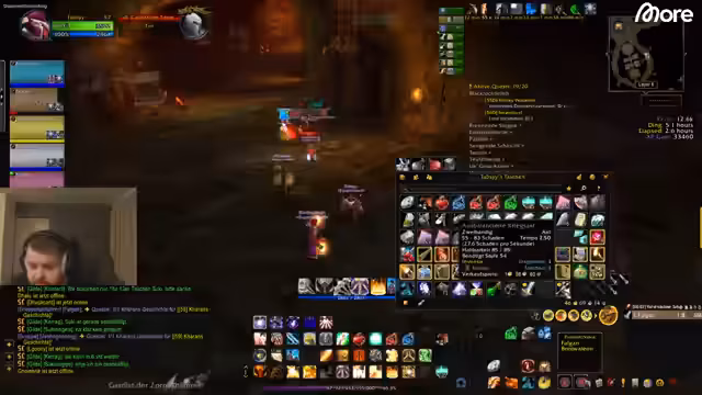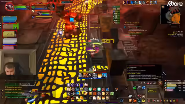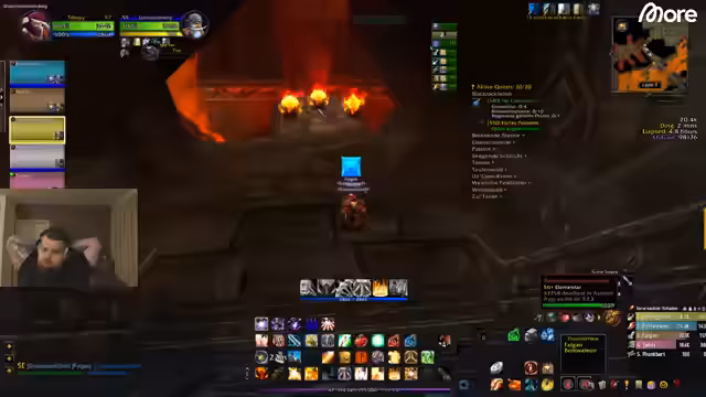 04:35:00Die Gruppe betritt Blackrock Depths und wird sofort mit Lava-Umgebung und Kettenmechaniken konfrontiert. Der Streamer warnt vor Fallen und schätzt Risiken ein – besonders bei 600 Schaden pro Sekunde durch Lava. Ein NPC wird für eine Quest interagiert, die normalerweise einen Tod erfordert, im Hardcore-Modus jedoch nicht. Während erste Kämpfe stattfinden, verteilt der Streamer weitere Items wie 'Öl des Feuerbrandes' und organisiert die Gruppe für den weiteren Verlauf des Runs.