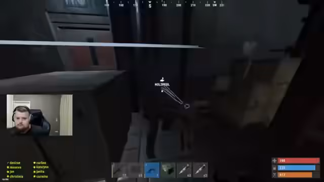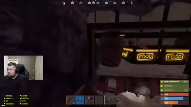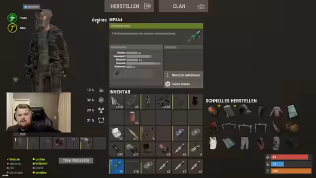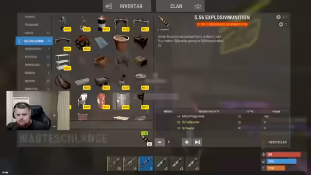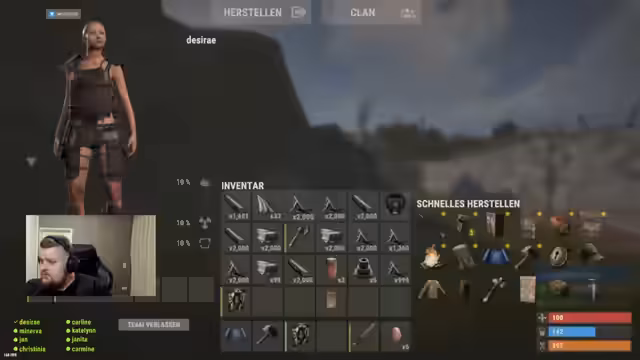 01:44:35Ein Platz in der Discord-Rolle wird frei, nachdem ein Spieler abgesagt hat. Das Stream-Team nutzt diese Gelegenheit, um Platz im Inventar freizumachen und überlegt, welches Material sie benötigen. Es wird diskutiert, dass zu viele Ressourcen wie Holz (Lowgrade) gesammelt wurden und man auf Components und Metall für den Bau von Waffen und Bunker-Ausrüstung fokussieren muss. Die strategische Verteilung von Inventarplätzen wird als wichtig erachtet.