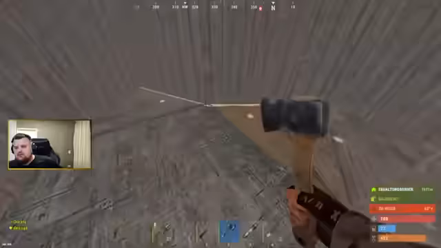 01:26:13Bei einem Angriff auf einen Milchtank wird der Streamer flankt und mit einem Boneclub attackiert, was ihn auf 30 HP reduziert. Ein weiterer Spieler, der allein mit einem Boot ankommt, wird ebenfalls von der Gruppe neutralisiert. Die Angreifer looten in Richtung des Krans, während der Streamer verspricht, den letzten Gegner auszuschalten.