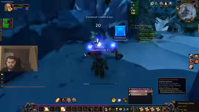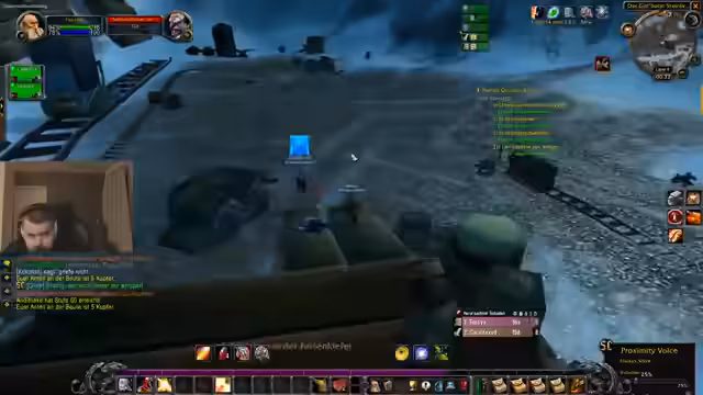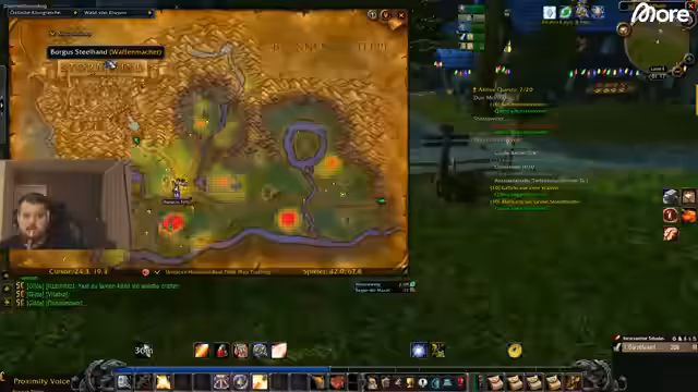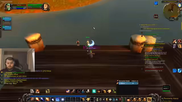 06:14:27Ein Spieler bevorzugt es, World of Warcraft auf Deutsch zu spielen, da seine Community überwiegend Deutsch spricht und er die englische Szene nicht verfolgt. Er erklärt, dass in anderen Games wie Rust Englisch notwendig sei, da es die internationale Spielsprache ist. Die Gruppe diskutiert eingedeutschte Begriffe im Spiel, wie 'Sturmwind' für Stormwind, und ein Spieler scherzt, dass er sich als 'Kapitän Maiko' besser fühlen würde. Es folgen strategische Überlegungen für einen Kampf, bei dem ein starker Gegner durch Kiting und langsames Besiegen bewältigt werden soll.