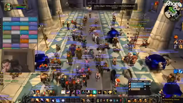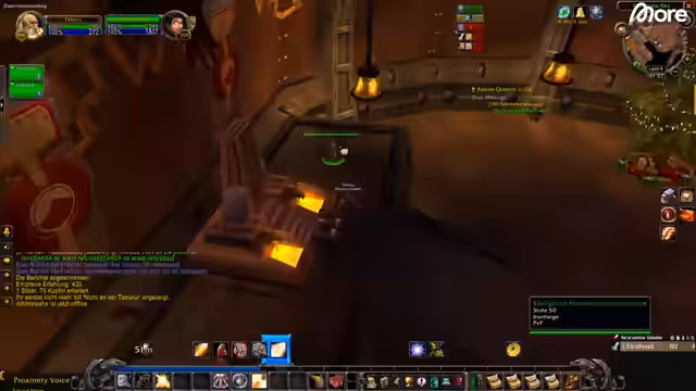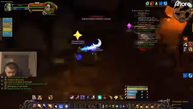 11:53:39Die Gruppe sucht nach Mobs für ihre Quests und diskutiert deren Spawn-Punkte, insbesondere hinter Häusern und in den Gebäuden. Sie entscheiden sich, eine Quest mit dem Titel 'Siegel der Rechtschaffenheit' auf Deutsch zu bevorzugen, anstatt der englischen Variante, da sie Schwierigkeiten mit der Sprachauswahl haben. Dabei stoßen sie auf einen Jäger, der einen Mob angreift, was zu Verwirrung führt. Sie planen, sich aufzuteilen, um Mobs effizienter zu bekämpfen, und bemerken die hohe Spielerdichte am Ort, was das Erledigen von Quests erschwert. Die Entscheidung, eine Quest abzubrechen, wird diskutiert, da sie nur 1000 XP bringt und zu viel Zeit in Anspruch nimmt.