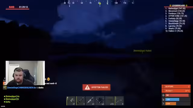 00:11:41Das Team beginnt einen Raid auf eine gegnerische Basis, wobei es zu intensiven Gefechten kommt. Der Streamer berichtet über einen besonders starken Gegner, der mit Head-Shots überproportional hohe Schäden verursacht, was zu Spekulationen über Cheating führt. Während des laufenden Raids kommt es zu Zwischenfällen, bei denen Teammitglieder getötet werden, was den Fortschritt des Angriffs beeinträchtigt und zu frustrierenden Situationen im Chat führt.