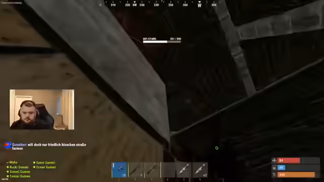 01:14:31Zu Beginn des Stream-Teils herrscht reines Chaos. Der Streamer ist sichtlich angetrunken und redet wirres Zeug, bezieht sich jedoch schnell auf den Spielinhalt. Er stellt fest, dass wichtige Ressourcen wie 'Eggies' und 'Roadside Gloves' fehlen und beklagt, dass sein Mitspieler Funker nicht anwesend ist. Daraufhin folgt ein intensives Crafting-Gespräch, bei dem es um das Herstellen von 'Brandammo', das Platzieren von 'Heavysets' in 'Lockern' und das Verteilen von 'Nitrogen-Goggles' geht. Der Fokus liegt darauf, die Basis mit den bestmöglichen Ausrüstungsgegenständen für den bevorstehenden Raid vorzubereiten und alle Spieler 'ready' zu machen.