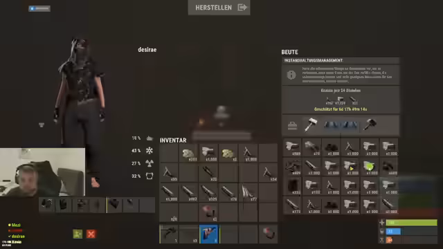 02:58:03Während des Streams werden aktuelle Updates im Spiel besprochen, darunter neue Gegenstände wie ein gepanzerter Häs und das Fehlen relevanter Änderungen. Der Streamer äußert sich über nervige Elemente wie den Helikopter-Event und die Zufallsevents, die oft die Spielerzahlen beeinflussen. Parallel dazu wird im Spiel über den Bau von reparierbaren Werkbänken und die Optimierung der Basisstrategie durch einen großen Shop diskutiert.