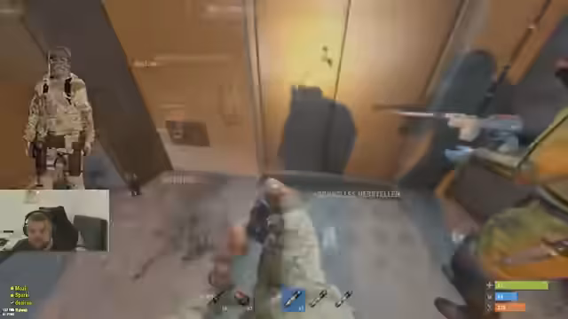 01:45:42Das Stream endet mit einem letzten, verzweifelten Kampf. Ein feindlicher Spieler hält die Gruppe mit einer Axt am Tor auf und provoziert sie. Die Situation eskaliert, als feindliche Nachbarn durch die Tür stürmen und die Spieler mit Schüssen wie der DB und Volly überfallen. Der Streamer ist im Besitz von 'Eggs', was vermutlich hochwertige Gegenstände oder eine wertvolle Ressource darstellt, deren Verbleib offen bleibt.