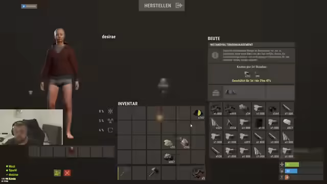 05:11:38Zurück im Spiel konzentriert sich der Streamer auf den Handel mit Loot. Er hat 'Fragmente' gesammelt und plant, diese mit seinem Teammitglied Sparky zu tauschen, um gemeinsam eine 'Werkstatt' auszubauen. Es folgt eine Diskussion darüber, wie man einen automatisierten Handel ('Shop') für seine Basis einrichtet, um Ressourcen effizient zu verwalten und zu schützen.