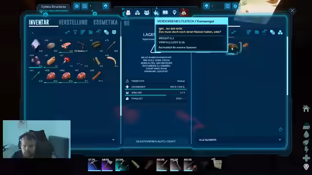 05:45:13Der Streamer stößt auf technische Herausforderungen, darunter eine kaputte Rüstung und Probleme mit der Steuerung. Er muss sein Inventar verwalten, da er verschiedene Items wie Pfeile, Flinte und natürliches Gift benötigt. Er erwähnt auch die Schwierigkeiten, Ressourcen wie Zement und Metall zu beschaffen, sowie die Herausforderungen, bestimmte Dinos wie Arcosaurs zu zähmen. Der Streamer zeigt Frustration über die Komplexität des Spiels, besonders wenn er alleine spielt.