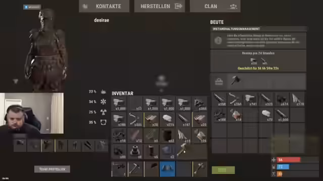 00:26:46Der Streamer äußert seine Frustration über die hohe Anzahl von Bots im Spiel, die durch Kästen schießen können, und spricht dies an. Er erwägt den Kauf eines Helikopters, um effizienter Öl farmen zu können, entscheidet sich aber dagegen, da er das Risiko zu hoch findet, auf dem Hinweg zu sterben. Stattdessen plant er, eine Tunnelstation zu bauen, da er auf der Oberfläche nicht genug Scraps findet. Er versucht, seine Ausrüstung zu optimieren, aber er hat nicht genug Ressourcen, um alle benötigten Gegenstände herzustellen.