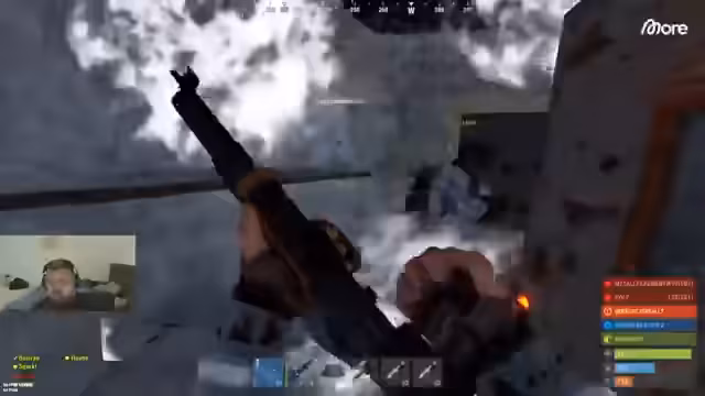 05:31:43Der Angriff auf die gegnerische Basis beginnt. Nachdem die Tür aufgebrochen ist, stürmt das Team in die Base. Es kommt zu einem heftigen Kampf, bei dem der Streamer und seine Mitspieler mehrere Gegner eliminieren. Der Gegner schießt mit Brandmunition und versucht, mit Granaten Druck auf das Team auszuüben. Das Team lootet intensiv, während der Streamer die Kommunikation im Team sicherstellt und auf weitere Gegner achten muss, die von hinten angreifen könnten.