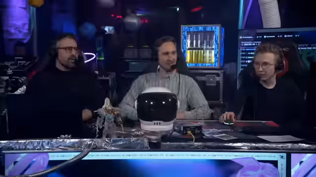 06:05:16Die Aufmerksamkeit richtet sich nun auf Rainer, der seine Serie gewinnen muss, um weiterzukommen. Das erste Spiel war für ihn eher schlecht, und es wird über eine mögliche Re-Match diskutiert. Es wird vermutet, dass Rainer mehr vom Hintergrund kommt, was jedoch von der Produktion korrigiert wird. Rainer sieht müde aus und wird auf seinen Jetlag angesprochen. Es wird überlegt, ob er einen Red Bull trinken soll, obwohl es keine mehr gibt. Es wird diskutiert, ob die Entscheidung, mit den Cyclonen anzugreifen, richtig war. Clem und Rainer sollen die Situation untereinander ausdiskutieren und entscheiden, ob ein Remake des Spiels fair wäre. Mixu hat ebenfalls Probleme mit seinem PC. Ein Helm mit Unterschriften wird gezeigt und herumgereicht. Es wird ein Bild von Sal gezeigt, das er zuvor einem anderen gezeigt hat. Es wird über die Herkunft des Namens "Pumpkin" gesprochen. Die Trophäe wird gezeigt und gelobt, wobei angemerkt wird, dass sie inhouse gedruckt und bemalt wurde. Reiner wird zurück in seinen Raum geschickt, da das Spiel bereit sein sollte.