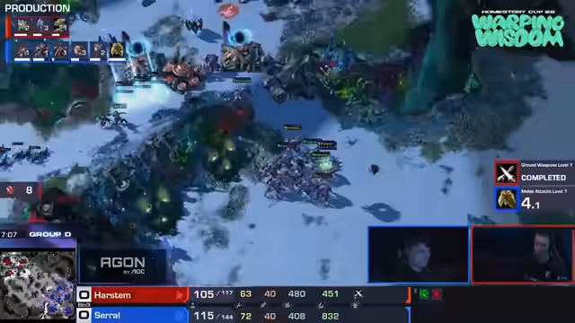 07:28:32Das Spiel beginnt mit strategischen Zügen beider Seiten. Harstam positioniert Stalker und zieht Probes, während BigGabe Widowmines einsetzt. Ein synchronisiertes Schießen führt zum Verlust von Metafacts, aber Harstam scoutet gut. BigGabe setzt auf Banshees für Harassment und baut einen Bunker zur Sicherheit. Er investiert in Engineering Bayonet, zusätzliche Rax und Stimpaks. Eine einzelne, ungecloakte Banshee wird eingesetzt, um den Gegner zu ärgern. Es wird über die geringe Verpflichtung durch Banshees diskutiert und wie man darauf reagieren soll, um nicht zu viele Probes zu verlieren. Die Balance Council Roulette und mögliche Änderungen an Einheiten werden angesprochen, einschließlich der Idee, SCB mehr HP zu geben, was jedoch verworfen wird. Harstam bereitet sich mit Colossus und zusätzlichen Gateways vor, während Riong SCBs für seine dritte Basis einsetzt und einen Pfad zur dritten Basis von Harstam sucht.