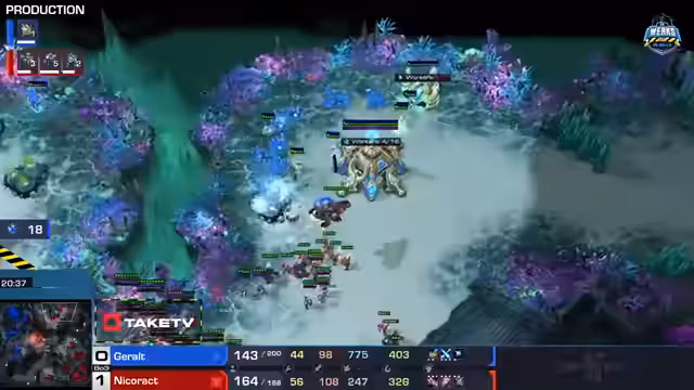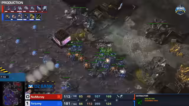 00:35:10Das Turnier beginnt mit spannenden Eröffnungsspielen. Im ersten Spiel trifft Yumi auf No Money und wählt überraschend Zerg, obwohl er normalerweise Protoss spielt. Das Spiel entwickelt sich zu einem Zerg gegen Terran Match. Yumi zeigt starkes Macro während No Money defensiv spielt und mit Dropangriffen versucht, Druck auszuüben. Letztendlich entscheidet Yumi das Spiel für sich mit einer überlegenen Armee und Ressourcenkontrolle.