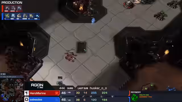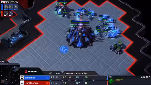 03:07:57Für den zweiten Satz spawnen die Spieler umgekehrt. Hero zeigt bemerkenswerten Kampfgeist, obwohl er in einem offensichtlich verlorenen Spiel steckt und weit zurückliegt. Der Kommentator vermutet, dass Hero sich vielleicht eingeschlafen hat oder auf einen Fehler von Clem hofft. Währenddessen wird das Wettverhalten des Chat-Nutzers CW11 diskutiert, der oft auf Clem setzt und dabei verliert. Spielstrategisch beobachtet man, wie Clem sich mit Bio-Einheiten (Marines, Medivacs) defensiv positioniert und Hero versucht, mit Blink-Stalkern aggressiv vorzustoßen.