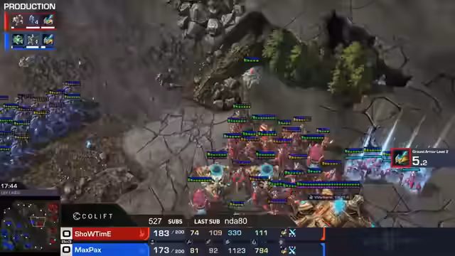 01:08:33Es folgt das Best of 3 Halbfinale zwischen Maxpex und Showtime. Clem hat bereits 2-0 gegen Mana gewonnen und wartet im Upper Bracket Final. Im Lower Bracket sind noch Yumi, Nikic, Nikorek, Geralt, Shameless, Elaser und Trigger vertreten. Showtime macht Druck mit zwei Batterien, aber Maxpex kontert mit seinem Wolfgang und Co. Showtime verteidigt erfolgreich mit Forcefields. Showtime hat eine Fortune Plus-1, die Maxpex fehlt, was ihm einen kleinen Vorteil im Midgame verschafft. Maxpex setzt Dark Templar ein, um Showtime zu harassen. Showtime hat mehr Stalker als Maxpex. Maxpex verteidigt seine vierte Base und baut eine fünfte. Showtime hat ebenfalls vier Basen und baut eine fünfte und sechste. Es geht darum, wer ein besseres Harassment oder bessere Kämpfe hinbekommt. Maxpex gewinnt das erste Spiel gegen Showtime. Im zweiten Spiel macht Showtime Druck und zerstört viele Worker von Maxpex. Maxpex zieht sich auf seine One Base zurück. Maxpex gewinnt das zweite Spiel und somit das Match mit 2:0.