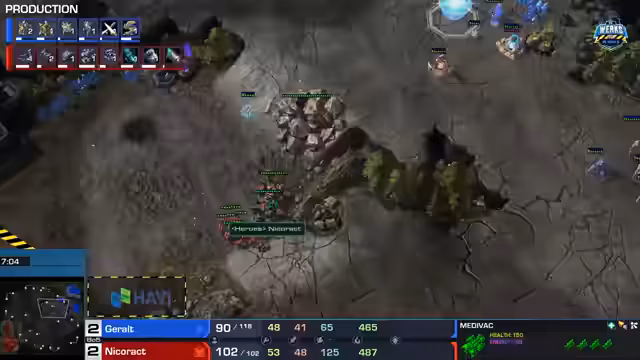 02:25:08Im zweiten Spiel zeigt Geralt eine härtere 3-Rex-Tank-Push-Strategie mit mehreren Tanks und Marines. Nikorekt setzt auf Blinkstalker und Robo-Einheiten, darunter Kolosse und Disruptoren. Kommentatoren heben die Bedeutung der Positionierung und der Einheitenkontrolle hervor. Geralt gerät trotz starker Anfangsphase ins Hintertreffen, da Nikorekt durch kluge Positionierung und Verwendung von Force-Fields die Oberhand behält.