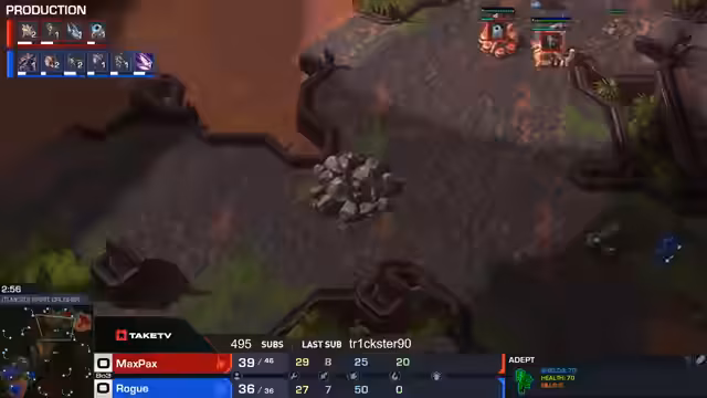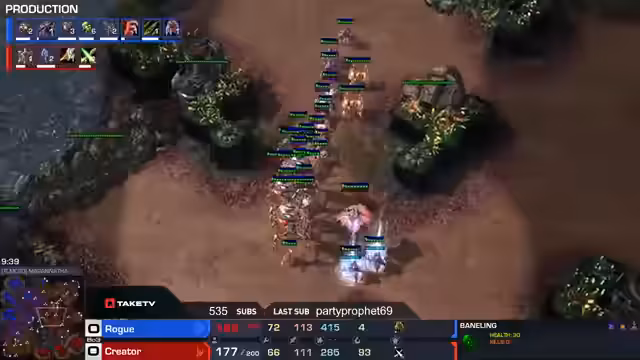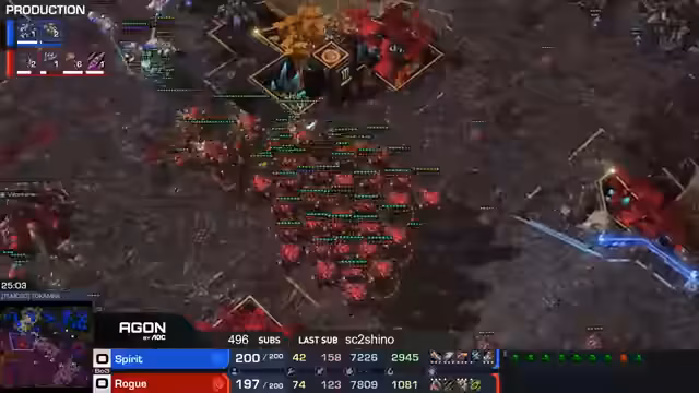 03:04:01Die Erstrundenpartie zwischen Rogue und Spirit auf der Map Replay entwickelt sich zu einem extrem langen und ausgeglichenen Spiel. Nach über 40 Minuten steht das Spiel unentschieden, da beide Spieler kaum noch Ressourcen für einen finalen Angriff haben. Spirit ist in der Lage, die gegnerische Armee mit Ghost-Snipes zu dezimieren, während Rogue mit Swarm Hosts und Lurker Harassment Druck aufbaut. Der Kommentator bezeichnet das Match als ein wildes, qualitativ hochwertiges Duell, das auf ein Unentschieden endet und eine Entscheidung auf einer dritten Map erfordert.