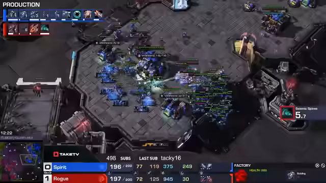 02:47:57Das Spiel zwischen Spirit und Rogue entwickelt sich in ein langes, technisches Makro-Game, bei dem beide Spieler auf eine große Anzahl an Basen expandieren. Spirit baut viele Overseer, um mit 'Changelings' effektiv zu handeln, während Rogue eine Army aus Marines, Ghosts, Ultras und Swarm Hosts aufbaut. Es kommt zu intensiven 'Trades', wobei besonders die 'Chain-Schlinge' von Spirit als extrem lästig für Rogues Armee beschrieben werden. Die Kommentatoren werten die gegenseitigen Spioneinsätze und die Geduld beider Spieler als Schlüssel zum Verständnis des Spiels.