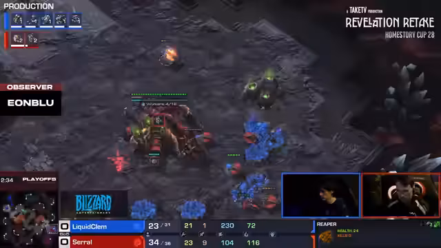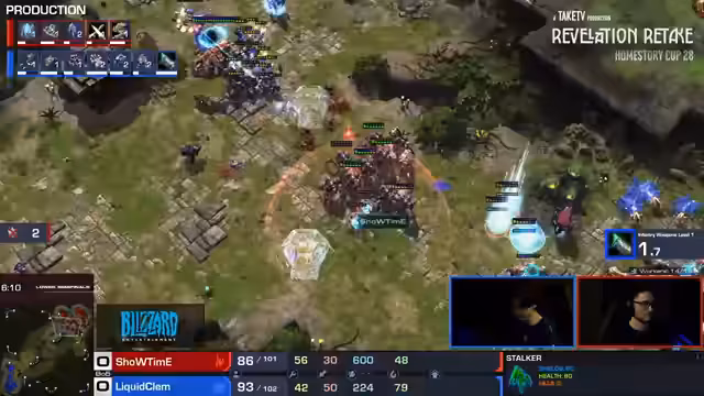 11:34:06Das Spiel eskaliert nach einem frühen, erfolgreichen Stürmer-Drop von Showtime bei Klemms Hauptbasis. Clem verliert mehrere SCVs, kann den Schaden aber begrenzen. Nachfolgend entbrennt ein grosser Kampf, in dem beide Spieler ihre Armen aufstocken. Showtime setzt auf eine kombinierte Einheit aus Stalkern, Zealots und Archons, während Clem mit Marines, Medivacs und Liberatoren antwortet. Ein entscheidender Moment ist die Zerstörung von Klemms Liberator durch einen Archon, was die Front für Showtime öffnet.