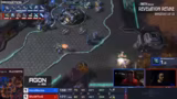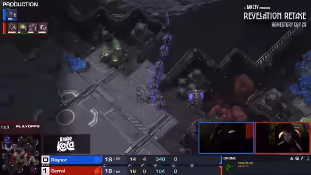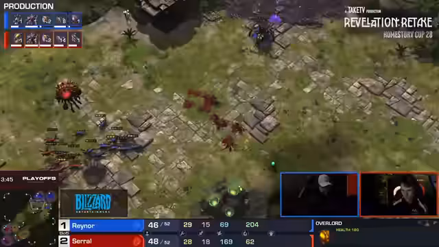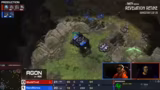 08:05:11Die Mitte des Spiels wurde von Showtimes Entscheidung für Dark Templars und Observer geprägt. Während der Robo-Fabrik gebaut wurde, plante Showtime, mit zwei oder drei Dark Templars ins Spiel zu kommen, um Clem zu stören. Clem setzte auf Scans und Reaper, um den Threat zu kontrollieren. Showtime behielt die Spielkontrolle und nutzte Observer, um über die Aktionen von Clem informiert zu bleiben, während Clem versuchte, mit einem Mid-Game-Push mit Bio-Truppen und später Ravens Vorteile zu erzielen.