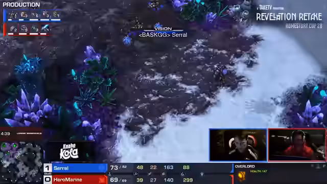 04:38:57Nach einem großen Kampf verliert Serral einen erheblichen Teil seiner Armee und wirtschaftlichen Basis. Kommentator Marc betont, dass Serrals Drone-Count auf einem katastrophalen Tief von 62 liegt, was für einen Zerg-Spieler in diesem Stadium des Spiels ungewöhnlich niedrig ist. Serral zwingt sich in eine typische Zerg-vs-Terran-Situation, in der er mit einer kleineren, spezialisierten Armee versuchen muss, den Sieg zu erringen, da seine Ökonomie nicht mehr mithalten kann.