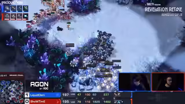 11:16:51Im ersten Spiel der Grand Finals zeigt Showtime ein ungewöhnliches Opening mit Phoenix und einer schnellen Robo-Fabrik, um Clem zu überraschen. Clem antwortet mit einem aggressiven Build, der auf Widowmines und Marines setzt. Das Spiel ist von intensiven Kämpfen und taktischen Manövern geprägt. Clem greift an, während Showtime versucht, mit Stürmern, Zealots und Archons zu kontern. Nach einem engen Kampf und mehreren grossen Attacken, insbesondere einem erfolgreichen Stürmer-Drop, kann Showtime die Oberhand gewinnen und das erste Spiel für sich entscheiden.