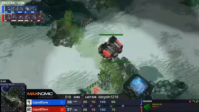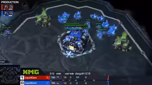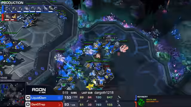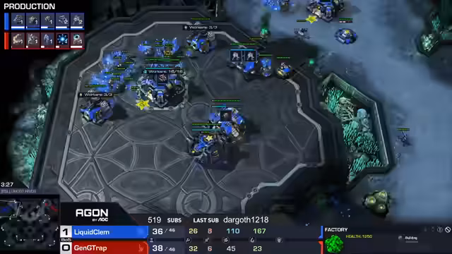 04:40:22Die Grand Finals beginnen mit Clem (blau) gegen Trap (rot). Clem startet mit einem starken Druck using Cyclones und Marines, was Trap in Schwierigkeiten bringt. Clem kontrolliert das Spiel und gewinnt nach einem anfänglich hart umkämpften Spiel mit einem klaren Sieg, gefolgt von einem 'GG'.