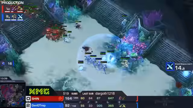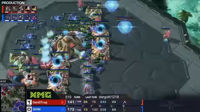 02:15:20Trap zeigt eine aggressive Spielweise mit frühem Druck auf Shins dritte Basis, indem er Zirkelinge baut und ein Stargate einsetzt. Shin verteidigt sich mit einem Oracle, aber Traps kontinuierlicher Druck zwingt ihn zu einer harten Entscheidung. Shin versucht mit einer Gruppe von Lingen anzugreifen, was jedoch fehlschlägt und ihm einen Nachteil verschafft. Trap verteidigt sich erfolgreich und verhindert, dass Shin Schaden anrichtet. Trotz Shins Bemühungen, sich zu verteidigen, gelingt es Trap, die Oberhand zu gewinnen. Shin setzt auf Swarmhosts aus Niduskanälen, um Traps Basis anzugreifen, aber Trap kontert effektiv und verhindert größeren Schaden. Shins Offensive zeigt wenig Wirkung, während Trap hinten Schaden erleidet. Trap verteidigt geschickt seine Basis und kontert Shins Angriffe, was ihm einen Vorteil verschafft. Trotz Shins Bemühungen, das Spiel zu drehen, behält Trap die Kontrolle und setzt seinen aggressiven Spielstil fort. Die Analyse deutet darauf hin, dass Traps Fähigkeit, gleichzeitig anzugreifen und zu verteidigen, Shin unter Druck setzt und ihm wenig Raum für eigene Aktionen lässt.