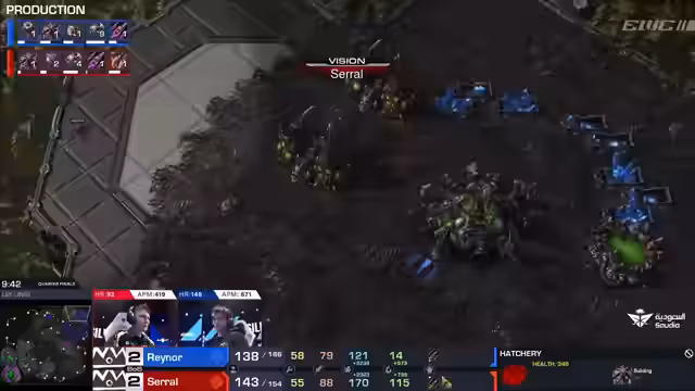 04:14:25In der fünften Map kämpfen Serral und Raynor um den Sieg in einer Best-of-Serie. Serral kann trotz Rückstand das Spiel drehen und Raynor besiegen. Die Kommentare loben das Spiel als würdig für eine Weltmeisterschaft. Serral zeigt auch unter Druck starke Nerven, was durch seine niedrige Herzfrequenz im Vergleich zu Raynor deutlich wird. Nach dem Sieg bleibt Serral im Turnier und erwartet nun einen Terran-Spieler im Halbfinale.