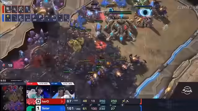 06:11:18Die Konzentration verlagert sich auf das Match zwischen Solar und Hero. Hero, für ein saudi-arabisches Team spielend, wird als lokaler Favorit bezeichnet. Solar agiert defensiver, während Hero ungewöhnliche Strategien einsetzt wie einen Stargate-Proxy und Fusion Core. Der Kommentar erklärt die unterschiedlichen Spielstile und prognostiziert einen spannenden Verlauf der Serie. Hero muss drei Spiele in Folge gewinnen, um im Turnier zu bleiben.