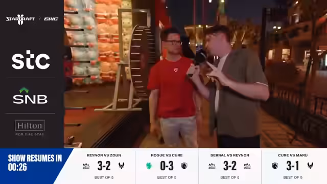 08:00:16Mit dem Ende des Viertelfinales wird auf die verbleibenden Turnierspiele geblickt. Im Lower Bracket trafen Kyo und Rogue aufeinander, während im Upper Bracket Serral gegen Cure und Solar gegen Classic antreten. Die Kommentatoren äußern ihre Vorfreude auf die anstehenden Matches und besonders auf ein mögliches Finale zwischen Classic und Serral, da beide Spieler bisher herausragende Leistungen gezeigt haben.