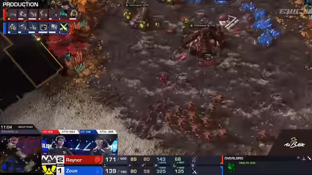 01:57:08Showtime beginnt mit dem Bau eines Orakels, während Classic aggressiv Pylonen angreift, um den Gegner bei Ressourcen auszuhungern. Der Bau des Orakels wird durch den Verlust mehrerer Pylonen behindert. Die Map-Kontrolle ist hier entscheidend, da Classic mit seiner stärkeren Armee und besserer Economy einen klaren Vorteil hat, der sich später in der Schlacht als fatal für Showtime erweisen wird.