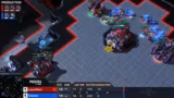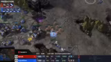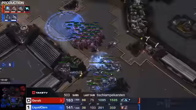 02:17:00Das Spiel ist ausgeglichen, bis Clem einen strategischen Wendepunkt herbeiführt. Der Kommentator beschreibt, wie Clem massenhaft Battlecruiser baut. Eine Gruppe von fünf Battlecruiser greift Geralt an und zieht sich zurück, um die geschwächten Einheiten von Geralt in einem zweiten Angriff zu vernichten. Diese Taktik beschreibt der Kommentator als "Fuck-off-Move". Geralt, der ebenfalls aggressiv spielt, kann den Angriff nicht abwehren und seine Arme wird dezimiert. Clem nutzt seinen Vorteil aus und baut weitere Battlecruiser, um den Sieg zu sichern.