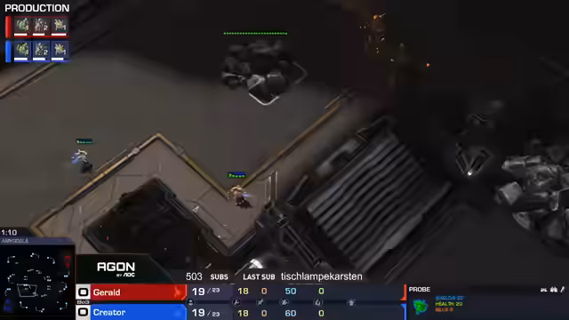 01:42:00Das Spiel zwischen Geralt und Bjarne beginnt. Der Kommentator analysiert die Eröffnung von Geralt, der einen Helion mit einer Mine als Köder positioniert. Diese Taktik zielt darauf ab, gegnerische Orakel auszuschalten. Währenddessen greift Bjarne erfolgreich mit Minidrops die Arbeiter von Geralt an und fügt ihm erheblichen wirtschaftlichen Schaden zu. Geralt ist nach der Anfangsphase mit einem signifikanten Arbeiter-Rückstand im Nachteil und muss versuchen, sich zu stabilisieren.