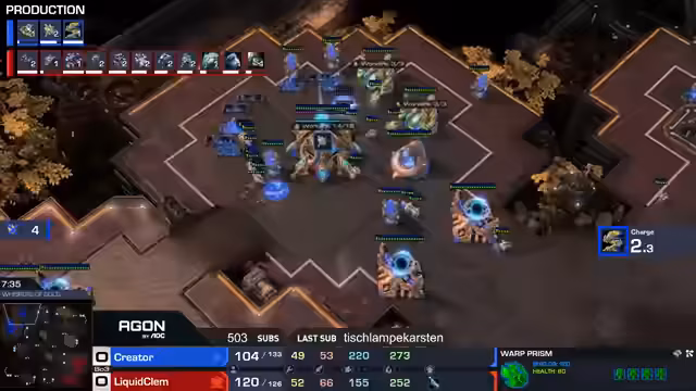00:39:37Das zweite Spiel auf Abyssal Reef beginnt und beide Spieler agieren erneut sehr ähnlich. Creator baut Stargates und Fleetbeacon und setzt auf Carrier, während Geralt auf Dark Shrine und Dark Templars setzt. Die DTs schlagen jedoch fehl, da Creator über gute Detektion verfügt. Creator nutzt seine starken Carrier, um Geralt Armeen zu dezimieren und mehrere Basen zu erobern. Das Spiel endet mit einer klaren Niederlage für Geralt, wodurch Creator zum 1:1 ausgleicht.