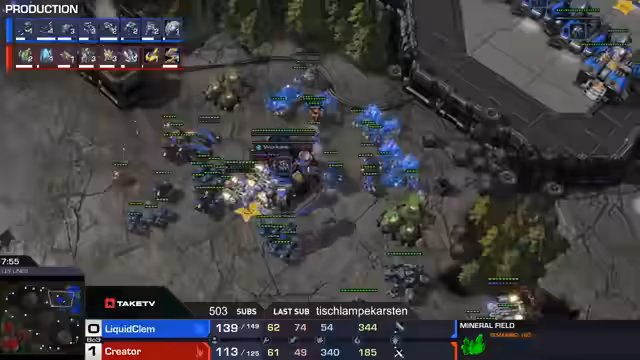 03:20:30Clem expandiert auf drei Basen, während Björn 91 Army Supply hat. Bisher war Björn komplett defensiv. Ein Scan entdeckt Medivacs, was für Clem eklig ist. Storms sitzen gut und verteidigen die Main-Base solide. Clem weiß genau, wie ein Terraner tickt und wie er seine Armee splitten muss. Zwei Salads zögern die Base des Gegners raus. Clem ist im Army Supply vorne und hat zwei Null-Upgrades gegen eins. Clem ist eine Kampfmaschine und könnte sogar Number One auf der Ladder werden. Die Zuschauer werden gefragt, was los ist. Die Zuschauer werden gefragt, was los ist. Es wird spekuliert, dass Clem keine Hilfe von Katze bekommen wird, da sie live nicht dabei war. Clem will PvT spielen, aber PvP und PvZ eigentlich nicht. Fürs Training wären das eigentlich nicht wirklich sinnvolle Matchups, außer er will wirklich swappen.