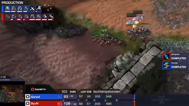 01:58:12Geralt spielt sehr aggressiv und nimmt 14 SUVs raus, aber seine Wirtschaft hinkt hinterher, da Bjarne drei OCs mit Mules hat. Geralts Upgrades sind schlechter und er hat keine Vision, aber er will trotzdem angreifen. Er hat keine Möglichkeit, etwas gegen den Raven zu tun. Der Streamer erwähnt, dass es dieses Jahr kein StarCraft bei der IEM Katowice geben wird. Geralt ist in der Wirtschaft ausgeglichen, hat aber immer noch 30 Armys weniger. Er schlägt einen Angriff zurück, aber ihm fehlt die Qualität. Storm Immortal kann gut funktionieren, wenn die Storms gut sitzen und die Menge an Einheiten passt, aber EMPs und Minen können verheerend sein. Der Streamer korrigiert sich und sagt, dass Katowice schon vorbei ist.