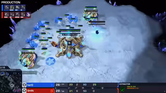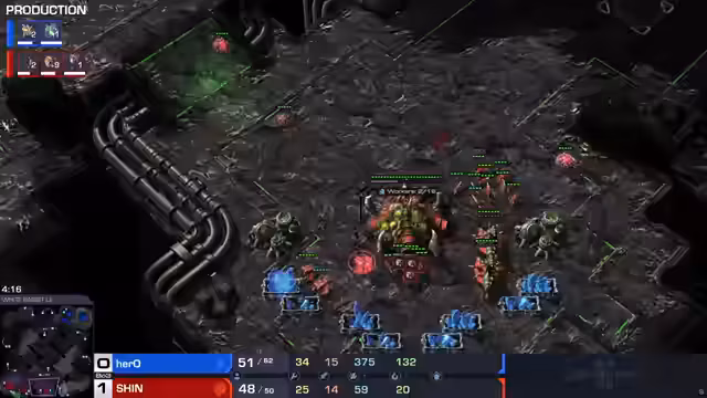 00:24:15Shin setzte auf einen Mutalisk-Angriff mit Cloaked Banshees, der jedoch nicht den gewünschten Erfolg brachte, da Heroes Orakel mit Stasis-Wards die Banshees neutralisierten. Shin verlor viele Mutalisken, was die Kommentatoren als verschwenderisch bezeichneten, obwohl seine Wirtschaft immer noch stark war. Hero versuchte, mit seinen Protoss-Einheiten zu verteidigen, aber Shins Hydralisken und Zerglinge waren zu stark. Hero musste schließlich aufgeben, und Shin gewann das Spiel mit 1:0. Die Kommentatoren lobten Shins solide Leistung und seine Fähigkeit, das Spiel zu dominieren, auch wenn er einige Fehler machte.