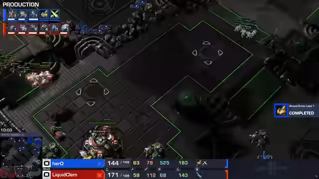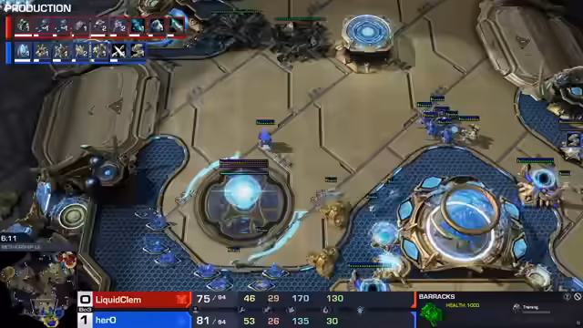 01:17:05Hero etabliert eine vierte Basis und baut seine Wirtschaft weiter aus, während Clem zögerlich agiert und seine vierte Basis noch nicht vollständig verteidigt. Clems Armee, bestehend aus Maraudern, Marines, Vikings und Medivacs, ist zwar beeindruckend, aber das Fehlen von Ghosts wird als Kritikpunkt hervorgehoben. Hero nutzt seine Kolosse und Disruptoren, um Clems Angriffe abzuwehren und seine Basen zu schützen. Ein Run-By von Hero auf Clems vierter Basis verursacht erheblichen Schaden, da diese ungeschützt ist. Trotz Clems starker Armee gelingt es Hero, durch geschickte Positionierung und den Einsatz von Dark Templars (DTs) entscheidende Vorteile zu erzielen. Clems Zögern und die fehlende Verteidigung seiner Expansionsbasen führen zu einem Rückstand.