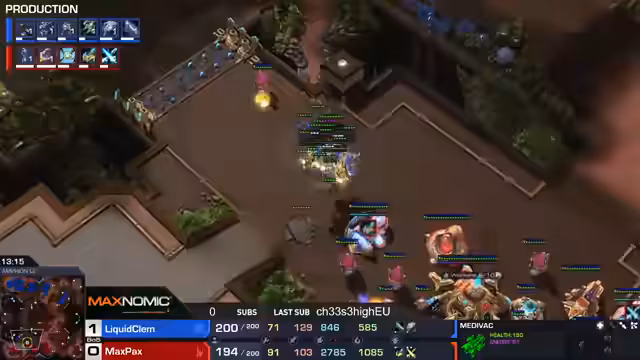 00:50:19Im Midgame baut Max-Pax kontinuierlich mit Salbador-Runbys und einem Dark Shrine auf DTs mit Blink, um Clem unter Druck zu setzen. Clem verteidigt sich mit Liberator und Planetary Fortresses und zeigt dabei exzellentes Micro, um die Protoss-Einheiten abzuwehren und gleichzeitig zu kontern. Der Kommentator analysiert, dass Clem aufgrund seines höheren mechanischen Skills scheinbar übermächtig agiert und denkt, dass Max-Pax vielleicht eine Tempest-Transition hätte versuchen sollen, um die Liberator zu bekämpfen.