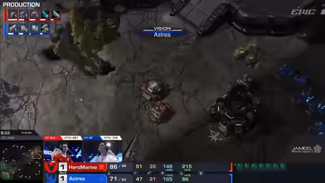 03:13:52Auf der zweiten Map ändert sich das Spielgeschehen dramatisch. Hero Marine führt einen cleveren Banshee-Angriff aus und tötet mehrere Arbeiter von Astrea. Durch diese wirtschaftliche Schwächung und konstanten Druck mit Bio-Einheiten kann er die Map für sich entscheiden. Er gleicht mit einem 1-1 aus und gleicht die Serie damit aus. Die Spannung steigt, da nun eine alles entscheidende dritte Map folgt, die über das Ausscheiden entscheidet.