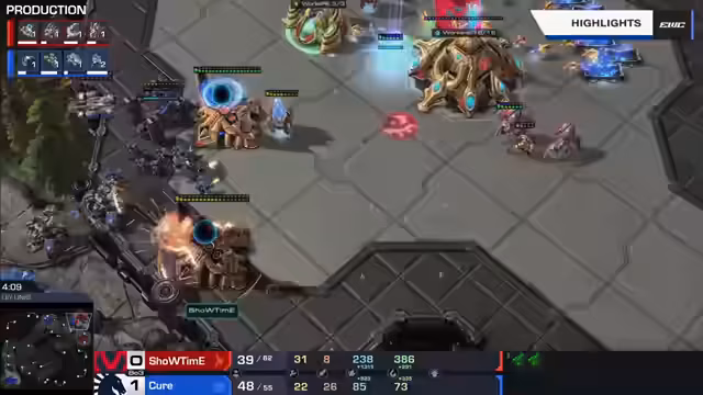 08:09:06Cure dominiert das Finale mit aggressiven All-Ins und einem perfekten Timing. Er gewinnt die erste Map knapp und die zweite Map nach einem brutalen 1-1-1-Build, der Showtime keine Chance lässt. Der Kommentator zeigt sich frustriert über die Effektivität von Cure, das Spiel als 'ekelhaft' bezeichnet, aber auch anerkennt, wie stark der koreanische Terraner spielt. Showtime wird aus dem Turnier eliminiert, und der Tag geht mit einem Sieg für Cure zu Ende.