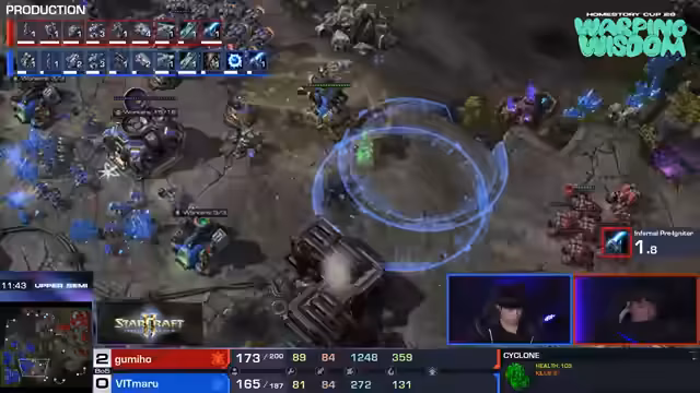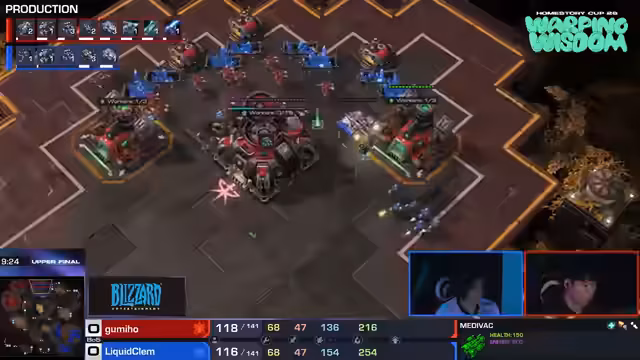 07:58:56Nach mehreren taktischen Fehlern und einer unkoordinierten Armee von Clem, der mit Protoss spielt, schlägt Gumiho zu. Er nutzt seine technischen Upgrades und eine überlegene Armee, um durch Clams Verteidigung zu brechen. Er zerstört die Expansion und greift direkt die Hauptbasis an. Clem, der sowohl an Armeestärke als auch an Wirtschaft zurückliegt, kann dem Angriff nichts mehr entgegensetzen und gibt auf. Gumiho gewinnt die Serie mit 3:1 und steht im Finale.