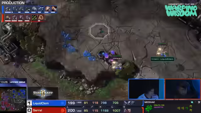 04:59:44Clem setzt auf Triple CC Hellion Banshee, was für Serol verheerend ist und zu einem frühen Rückstand führt. Serol startet mit +1 Armor, bricht ab, startet neu, versucht die Basis zu halten, aber die Cloak Banshees sind zu stark. Gumiho gewinnt gegen Maru, was ein gutes Ergebnis ist. Clem gewinnt, dann sind Gumiho und Clem im Upper Bracket. Serol macht das Gleiche wieder, Roaches in Ultras und Fleezes in Banshee, zwei Tanks in Widowmines. Clem fügt Serol wiederholt Schaden zu, was es schwer macht, zurückzukommen. Serol kann keinen Creep auf der linken Seite bekommen, was seine Verteidigungsmöglichkeiten einschränkt. Clem geht mit zwei Tanks und viel Bio in die Mitte der Karte und versucht erneut, die vierte Basis anzugreifen. Serral startet einen Gegenangriff mit Blinding Clouds und Banes, was ihm etwas Spielraum verschafft, aber er ist immer noch im Rückstand. Clem beendet 2-2 Upgrades, während Serol eines auslassen musste. Serral benötigt einen weiteren guten Kampf, um das Spiel zu drehen. Clem belagert die Basis von Serral vom Low Ground aus, was es für Serral schwierig macht, sich zu verteidigen. Clem spielt defensiver und verlangsamt das Spiel. Serral versucht einen Angriff mit Ravagern, aber es reicht nicht aus. Clem geht zu Ghosts über und wird bald 3-3 haben.